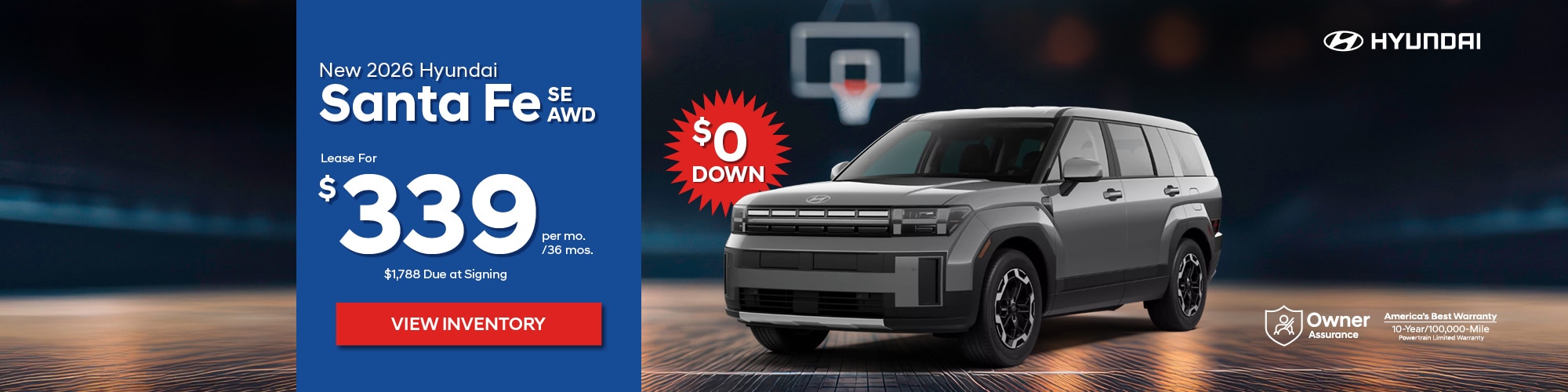New 2026 Hyundai Santa Fe SE AWD. $339/36 months. AWD, automatic, 4 cyl, Air, Power Brakes/Steering. Vin#TH183133, STK #23503. MSRP: $39,030. Price incl: and $500 Military (must qualify), or $500 1st Responder (must qualify) $400 Recent College Grad (must qualify). Lease based on 36 mos with purchase option of $28,601 available at lease end. Mileage: 7,500 miles p/yr; 20¢ p/mi thereafter. $0 down + $799 Doc Fee + $650 Bank Fee + $339 First month's payment + $0 Security Deposit = $1,788 Due at signing. Total cost of lease: $13,653. Total monthly payments: $12,204. Price includes all costs to be paid by the consumer, except for licensing, registration and taxes. Lessee is responsible for excess wear and use, maintenance, repairs. $0 down available with approved credit. See dealer for complete rebate qualifications. Offer expires 3/31/26.