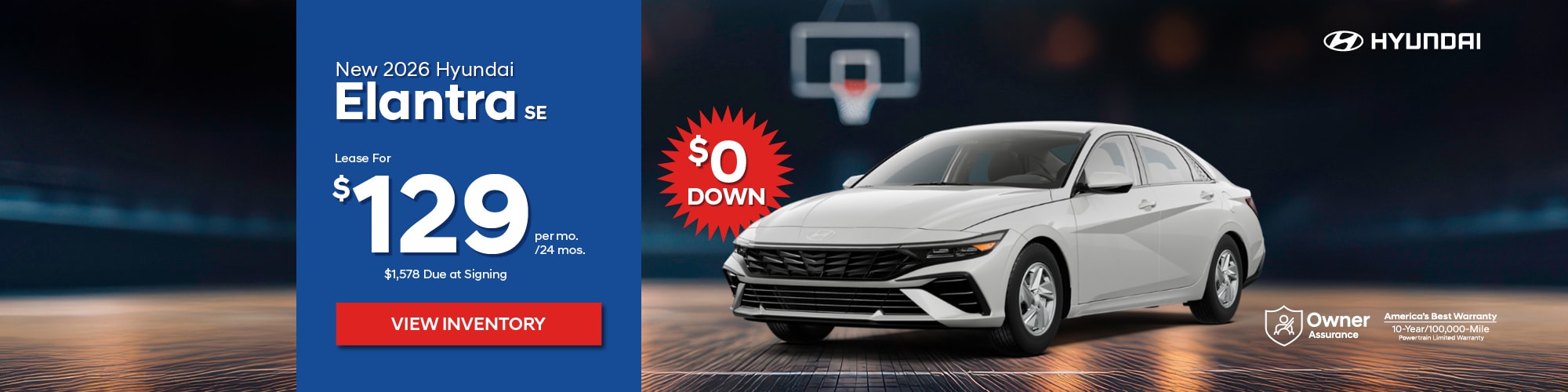 New 2026 Hyundai Elantra SE. $129/24 months. FWD, automatic, 4 cyl, Air, Power Brakes/Steering. Vin#TU118342, STK #23304. MSRP: $24,480. Price incl: $2,000 Lease Cash and $500 Military (must qualify), or $500 1st Responder (must qualify) $400 Recent College Grad (must qualify). Lease based on 24 mos with purchase option of $18,256 available at lease end. Mileage: 7,500 miles p/yr; 20¢ p/mi thereafter. $0 down + $799 Doc Fee + $650 Bank Fee + $129 First month's payment + $0 Security Deposit = $1,578 Due at signing. Total cost of lease: $4,545. Total monthly payments: $3,096. Price includes all costs to be paid by the consumer, except for licensing, registration and taxes. Lessee is responsible for excess wear and use, maintenance, repairs. $0 down available with approved credit. See dealer for complete rebate qualifications. Offer expires 3/31/26.