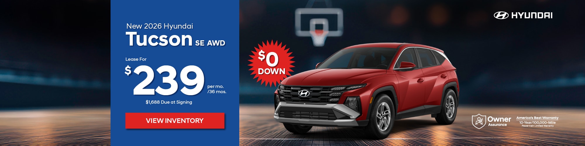 New 2026 Hyundai Tucson SE AWD. $239/36 months. AWD, automatic, 4 cyl, Air, Power Brakes/Steering. Vin#TH616643, STK #22952. MSRP: $33,755. Price incl: $4,000 Lease Cash and $500 Military (must qualify), or $500 1st Responder (must qualify) $400 Recent College Grad (must qualify). Lease based on 36 mos with purchase option of $19,419 available at lease end. Mileage: 7,500 miles p/yr; 20¢ p/mi thereafter. $0 down + $799 Doc Fee + $650 Bank Fee + $239 First month's payment + $0 Security Deposit = $1,688 Due at signing. Total cost of lease: $10,053. Total monthly payments: $8,604. Price includes all costs to be paid by the consumer, except for licensing, registration and taxes. Lessee is responsible for excess wear and use, maintenance, repairs. $0 down available with approved credit. See dealer for complete rebate qualifications. Offer expires 3/31/26.