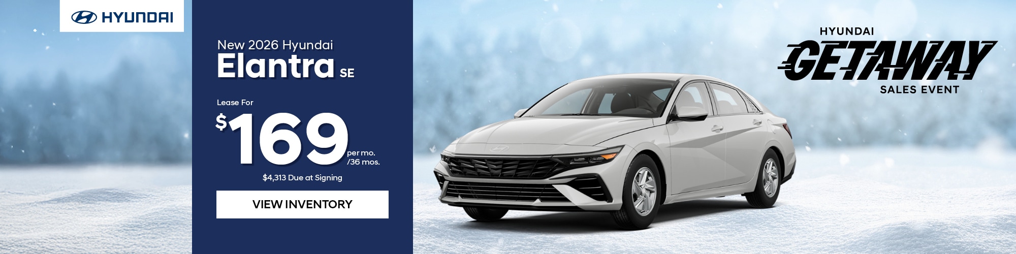 New 2026 Hyundai Elantra SE. $169/36 months. FWD, automatic, 4 cyl, Air, Power Brakes/Steering. Vin#TU108101, STK #23135. MSRP: $24,510. Price incl: $1,000 Lease Cash. Additional rebates available (must qualify): $500 First Responder), $500 Military Rebate or $400 College Rebate. Lease based on 36 mos with purchase option of $16,176 available at lease end. Mileage: 7,500 miles p/yr; 20¢ p/mi thereafter. $2,999 down + $495 Doc Fee + $650 Bank Fee + $169 First month's payment + $0 Security Deposit = $4,313 Due at signing. Total cost of lease: $10,228. Total monthly payments: $6,084. Price includes all costs to be paid by the consumer, except for licensing, registration and taxes. Lessee is responsible for excess wear and use, maintenance, repairs. See dealer for complete rebate qualifications. Offer expires 1/5/26.