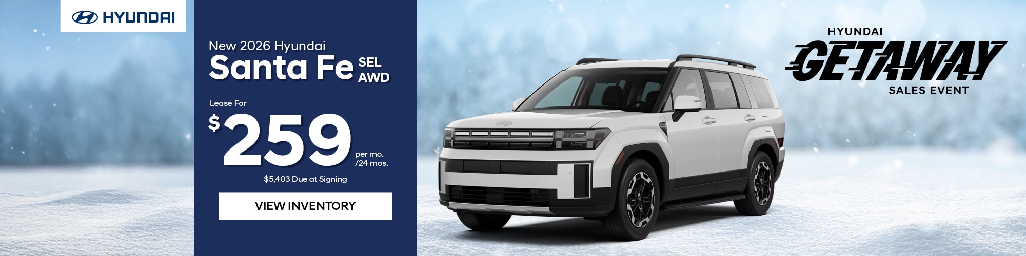 New 2026 Hyundai Santa Fe SEL AWD. $259/24 months. AWD, automatic, 4 cyl, Air, Power Brakes/Steering. Vin#TH161892, STK #22991. MSRP: $42,060. Price incl: $1500 Lease Cash. Additional rebates available (must qualify): $500 First Responder), $500 Military Rebate or $400 College Rebate. Lease based on 24 mos with purchase option of $28,601 available at lease end. Mileage: 7,500 miles p/yr; 20¢ p/mi thereafter. $3,999 down + $495 Doc Fee + $650 Bank Fee + $259 First month's payment + $0 Security Deposit = $5,403 Due at signing. Total cost of lease: $11,360. Total monthly payments: $6,216. Price includes all costs to be paid by the consumer, except for licensing, registration and taxes. Lessee is responsible for excess wear and use, maintenance, repairs. See dealer for complete rebate qualifications. Offer expires 1/5/26.