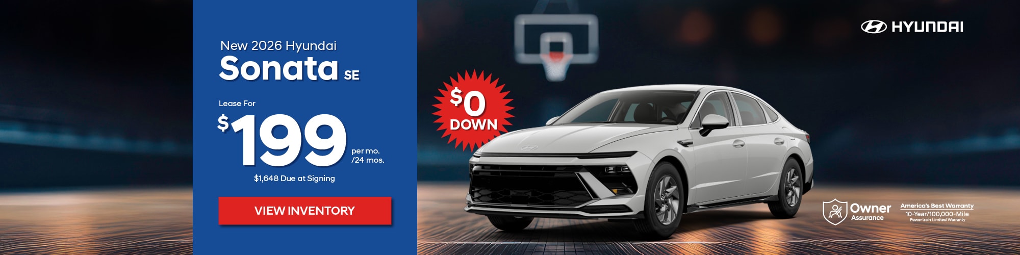 New 2026 Hyundai Sonata SE. $199/24 months. FWD, automatic, 4 cyl, Air, Power Brakes/Steering. Vin#TA527728, STK #22966. MSRP: $29,130. Price incl: $750 Lease Cash and $500 Military (must qualify), or $500 1st Responder (must qualify) $400 Recent College Grad (must qualify). Lease based on 24 mos with purchase option of $17,769 available at lease end. Mileage: 7,500 miles p/yr; 20¢ p/mi thereafter. $0 down + $799 Doc Fee + $650 Bank Fee + $199 First month's payment + $0 Security Deposit = $1,648 Due at signing. Total cost of lease: $6,225. Total monthly payments: $4,776. Price includes all costs to be paid by the consumer, except for licensing, registration and taxes. Lessee is responsible for excess wear and use, maintenance, repairs. $0 down available with approved credit. See dealer for complete rebate qualifications. Offer expires 3/31/26.