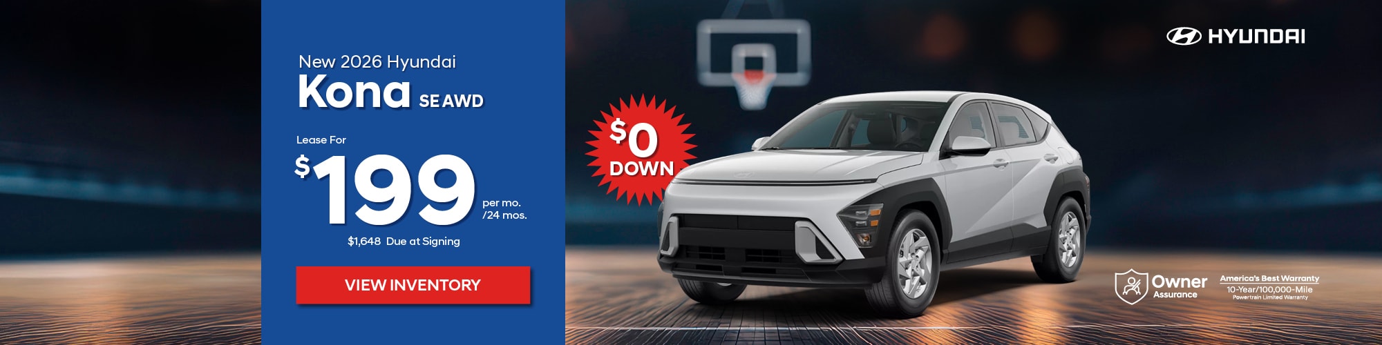 New 2026 Hyundai Kona SE AWD. $199/24 months. AWD, automatic, 4 cyl, Air, Power Brakes/Steering. Vin#TU435407, STK #23490. MSRP: $29,135. Price incl: $2,000 Lease Cash and $500 Military (must qualify), or $500 1st Responder (must qualify) $400 Recent College Grad (must qualify). Lease based on 24 mos with purchase option of $22,511 available at lease end. Mileage: 7,500 miles p/yr; 20¢ p/mi thereafter. $0 down + $799 Doc Fee + $650 Bank Fee + $199 First month's payment + $0 Security Deposit = $1,648 Due at signing. Total cost of lease: $6,225. Total monthly payments: $4,776. Price includes all costs to be paid by the consumer, except for licensing, registration and taxes. Lessee is responsible for excess wear and use, maintenance, repairs. $0 down available with approved credit. See dealer for complete rebate qualifications. Offer expires 3/31/26.